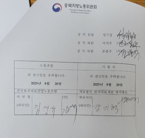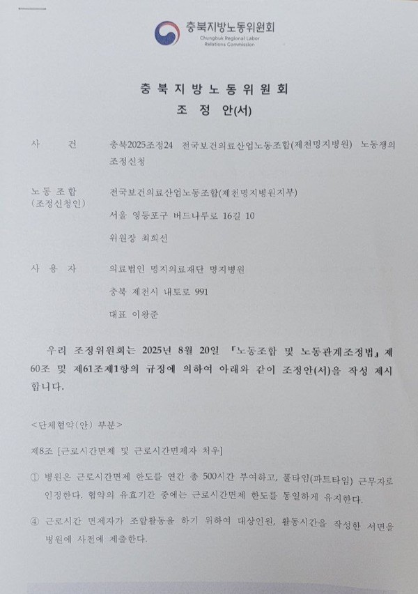 제천명지병원과 전국보건의료산업노동조합 제천명지병원지부가 충북지방노동위원회의 조정안을 최종 수락했다.