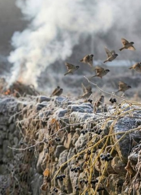 놀란 참새 한 무리 포르릉