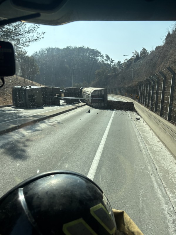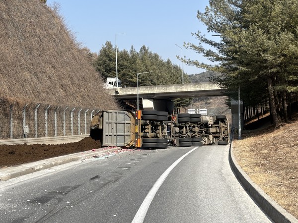 20일 낮 12시 52분께 충북 단양군 매포읍 적성면 각기리 중앙고속도로 북단양나들목에서 25톤 덤프차량이 전복되는 사고가 발생했다.