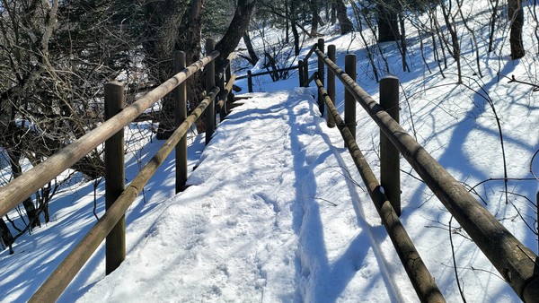 녹지 않은 눈이 얼어붙어 곳곳에 빙판길이 이어지고 등산객들은 자연스럽게 아이젠을 신는다. 배낭 속에 넣어 두었던 방한장갑과 모자도 다시 꺼내야 한다.