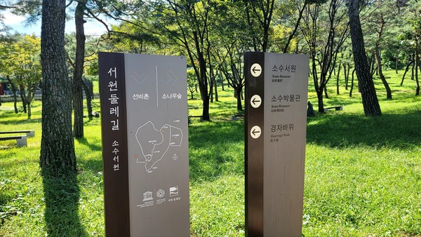 '서원둘레길' 안내판을 보니 보물을 찾은 듯 기쁘다. 왼쪽은 선비촌, 오른쪽은 소나무숲이다. 주저없이 소나무숲으로 향했다.