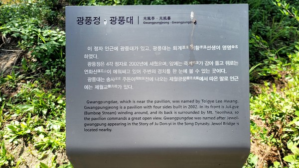 이제, 바람이 걸음을 쉬게 하는 곳! 광풍정(光風亭)쪽으로 걸어본다. 본래 '광풍대'라고 불리었는데, 퇴계 이황이 '제월광풍(霽月光風)'에서 따서 붙인 이름이다. 마음이 넓고 쾌활하여 아무 거리낌없는 인품을 말한다.