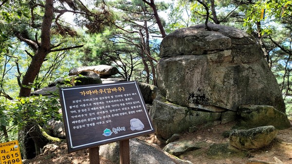 가마바우는 모양이 가마(탈 것)처럼 생겨서 붙여진 이름이다. 가마바우 뒷편으로 전통 보료같은 납작한 바위가 눈에 띈다. 주변에는 많은 사람의 정성이 담긴 돌탑이 이색적이다.