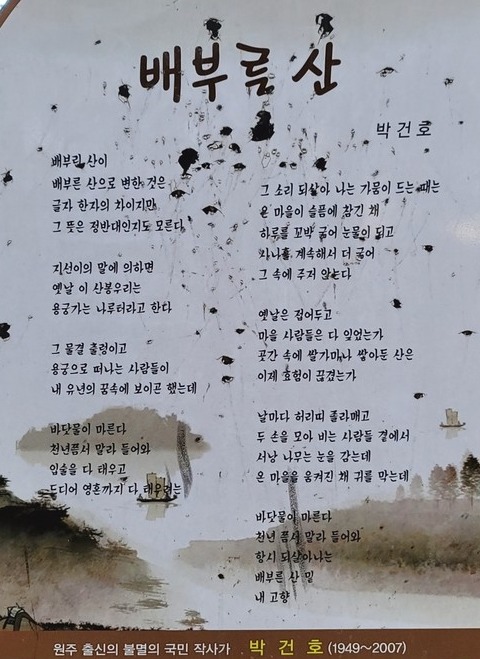 숲길 중간중간 전시하는 원주 출신의 국민 작사가 박건호님의 시(詩)는 오솔길이 못다한 이야기를 대신 전해준다. 시(詩)는 걸음을 멈추게 한다. 눈으로 보고 마음으로 읽는다. 이 가을과 딱 어울린다.