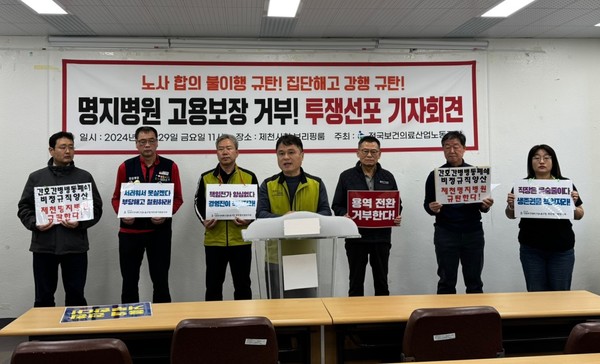 전국보건의료산업노동조합은 제천명지병원이 노사 합의 를 이행하지않고 집단 해고를 강행했다며 규탄 기자회견을 했다.