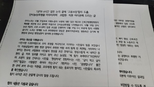노조가 발표한 ‘단식농성투쟁을 마무리하며’라는 글을 보면 ▶병원은 간호간병 통합병동 재개소에 최선을 다하며 근속 2년 미만차 4명은 재개소시 우선채용하며 경력 인정 ▶미화직 노동자는 간접고용으로 전환하며 현행 임금수준과 근속기간 인정, 의료비감면, 정년보장을 합의했다.