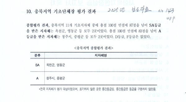 올해는 D·F등급은 아예 없고, B·C등급은 등급 표기 없이 평가됐다는 점을 고려하면, 제천시는 사실상 중하위권(B 또는 C등급)으로 평가됐을 가능성이 크다.