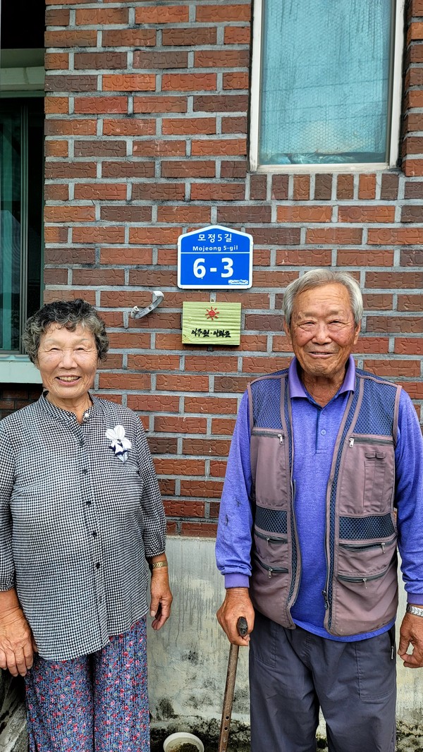 ‘메리골드’ 집 주인인 이주원(88)·이화춘(80) 어르신 부부는 문패 앞에서 사진을 찍으며 즐거워했다.