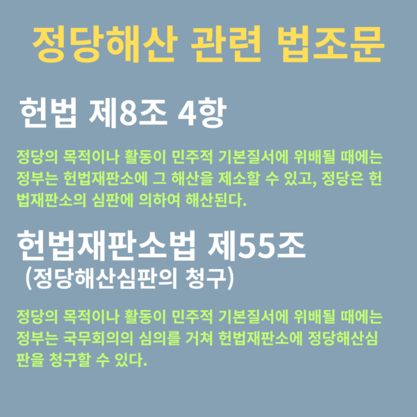 현행 헌법 제8조 4항은 “정당의 목적이나 활동이 민주적 기본질서에 위배될 때는 정부는 헌법재판소에 그 해산을 제소할 수 있으며, 정당은 헌법재판소의 심판에 의하여 해산된다”고 명시하고 있다.