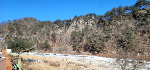 2㎞ 정도 지나자, 도로 옆으로 야자수 매트가 깔려있다. 서마니 강변길을 알리는 대문과 함께 도로 옆 데크길로 연결된다. 도로 바로 옆이지만 차도와 구분해 안전하다. 데크길 오른쪽으로 맑고 깨끗한 강이 투명 유리알에 갇혀 멈췄다. 바로 아래 깨진 얼음 사이로 물이 흘러간다. 종이 한장 차이를 두고 멈춰버린 강물과 흐르는 강물이 구분된다. 강 한가운데 기암괴석에 자연스레 걸음을 멈춘다. 마치 도담삼봉을 연상케하는 바위가 반갑다. 수풀로 가려져 모습을 온전히 감상할 수 없어 아쉽지만 데크길이 주는 낭만과 여유는 마음을 편안하게 한다.