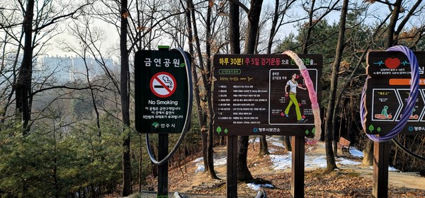 산중턱을 자른듯 평평하고 널찍한 광승산 정상에는 운동기구와 안내판이 깔끔하게 정리되어 있다. 올바른 걷기방법을 보며 자세를 고쳐본다. 우선 상체를 똑바로 펴고 바른 자세로 서야 한다. 몸에 과도한 힘을 주지 말고 자연스럽게 정면을 본다. 팔은 앞뒤로 흔들며 걷도록 한다. 걸을 때는 발뒤꿈치에서 발 중앙, 발가락의 순으로 앞으로 내딛는다.