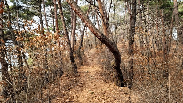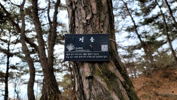 호흡을 가다듬으며 얼마를 오르자 붉은 흙길과 푸른 소나무가 나타났다. 뭉친 어깨의 근육이 풀리며 묵직했던 마음도 가벼워졌다. 헉헉 요동치던 심장이 편안해지면서 숲속에서 새소리가 들려왔다. 산새가 나무의 이름표를 보고 '적송'이라고 알려주는 듯 하다.