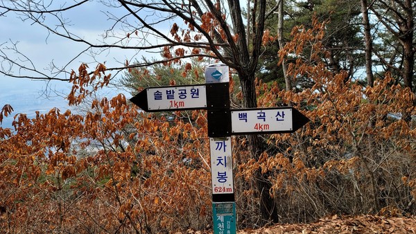 등줄기에 땀이 흥건할 때 까치봉(624m)에 도착했다. 키 작은 이정표의 글씨가 반갑다. 물 한모금 마시고 다시 걷는다. 고적한 숲길이 스치는 바람에 흔들리며 마른 낙엽 아래 숨어 있던 겨울을 불러냈다. 군데군데 숨어 있는 빙판길이 조심스럽다. 이제 솔봉으로 향한다. 까치봉에서 300미터 쯤 가면 솔봉(741m)이다. 나무에 가려 조망은 없다. 나뭇가지 틈으로 보이는 조각난 전경을 퍼즐 게임처럼 맞춰본다.
