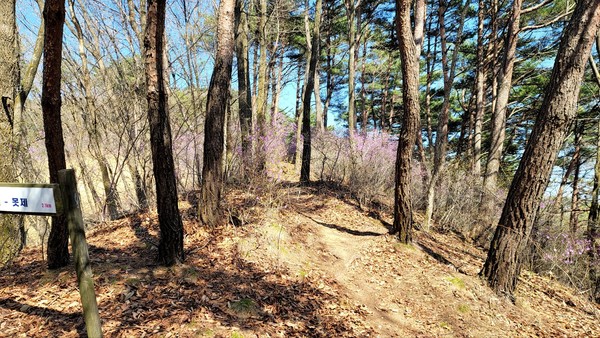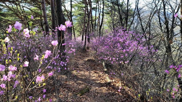 계속되는 흙길에 발걸음이 신났다. 바람과 함께 전해지는 숲내음에 엔도르핀이 샘솟는다. 소나무 틈으로 숨은 진달래를 따라 걷다보니 군락지가 나타났다. 봄의 정취를 한껏 느낀다.