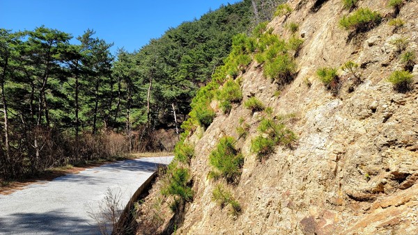 은근한 오르막이다. 잠시 멈춰 주변을 둘러본다. 임도를 만들기 위해 깍은 산비탈에 여린 잎의 소나무가 한들한들 춤을 춘다. 바람에 날린 씨가 바위틈의 흙을 찾아 뿌리를 내렸다. 소나무의 생명력이 그저 놀라울 따름이다.