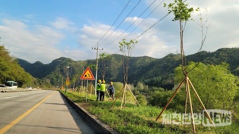 단양군은 5월초까지 7천여만원을 들여 단양군 매포읍 하괴삼거리~도담삼봉 입구 1.2㎞ 구간에 복자기 218그루를 심고 있다.