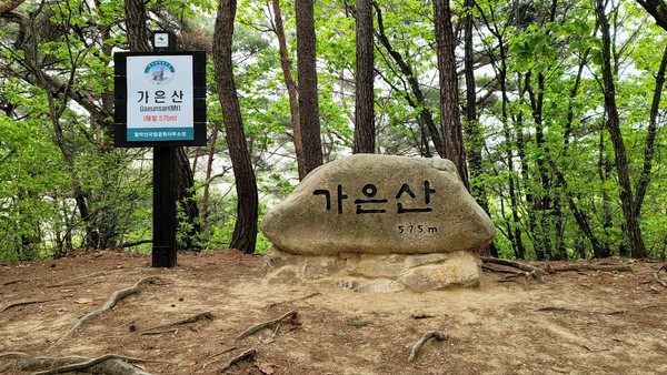 나무로 둘러쌓인 정상은 포근하다. "하나, 둘, 셋" 정상석이 포즈를 잡고 사진을 찍을 수 있도록 신호를 보낸다. "찰칵" 가은산이 활짝 웃고 있다.