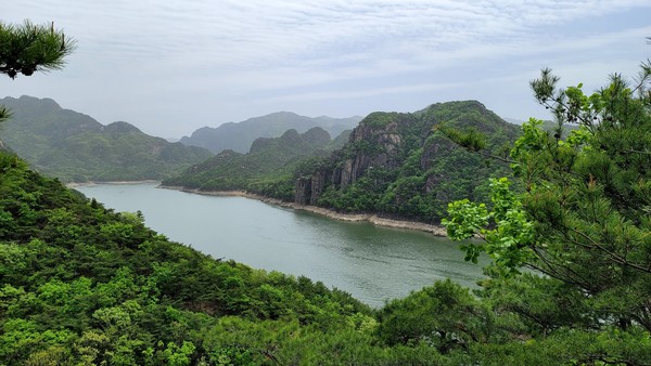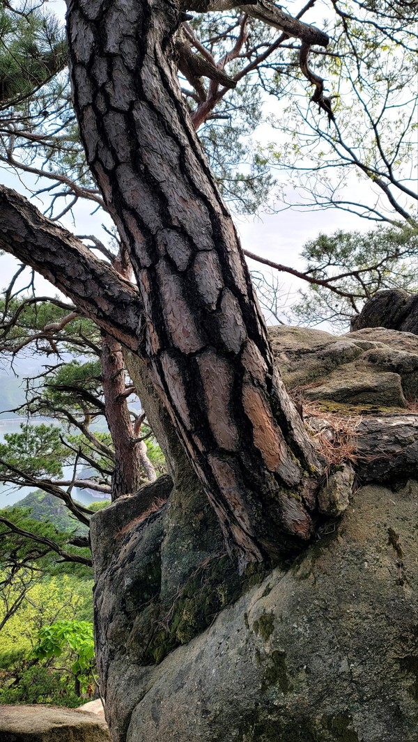 푹신한 흙길에 박힌 돌들이 우직하다. 울퉁불퉁한 길이 발바닥을 자극한다. 돌길을 지나자 하늘과 가까워진다. 강물과 가까운 바위산의 나무들은 키가 작다. 영양분을 덜 받아서인지, 바람의 영향인지는 모르겠다. 올망졸망한 소나무가 분재처럼 멋스럽다.