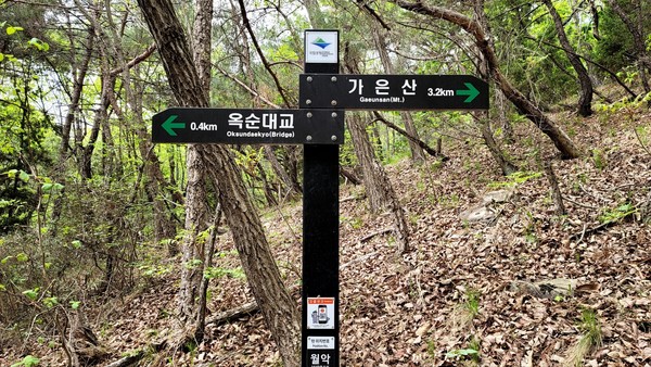 등산 초입부터 얕은 오르막이다. 얼마 지나지 않아 옥순대교 전망대를 알려주는 이정표가 보인다.