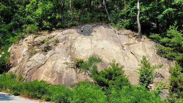 땀을 식힐 자리를 찾았다. 작지만 평평한 바위가 있다. 시원한 그늘의 바위가 마치 봉하마을 노무현 대통령님 작은비석 같다. 잠시 서서 물 한모금 마신다. 앞을 보니 석벽이다. 마애불을 만들 수 있을 정도로 매끈하다.