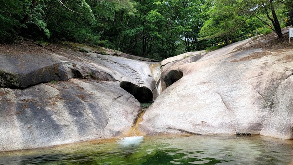 선유구곡길 암반은 널따랗고 넉넉하다. 언제 찾아도, 무슨 말을 해도 받아주시는 어머니 품 같다. 맘속에는 유년시절의 추억과 함께 일곱빛깔 무지개가 떠올랐다.