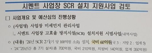 국민의힘 엄태영(제천.단양) 국회의원실에서 나온 '시멘트 사업장 SCR 설치 지원사업 검토' 문건에 따르면 환경부는 내년도 200억원을 들여 저감시설 2기를 계획중이다.