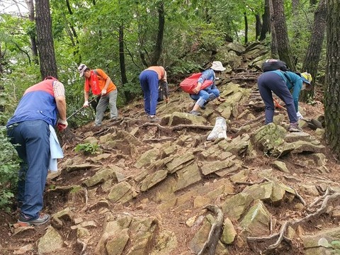 이 회장 등 15명의 회원들은 장맛비로 유실된 등산로에 흙을 채우고 횡단 배수로를 설치했다.