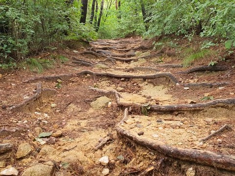 경사도에 따라 흘러내린 토사를 활용해 가로 횡단 배수로를 설치할 경우 80% 이상 등산로 유실을 막을 수 있다.