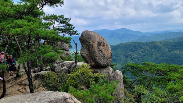 오늘 산행은 더위때문에 생각보다 많은 에너지가 필요하다. 완만한 흙길과 울퉁불퉁 바위길이 반복된다. 사방이 탁 트여 조망이 좋다. 흙길이 지루할 때쯤 나타나는 암릉은 어린시절을 소환한다. 또래보다 키가 컸던 나는 높은 곳에서 쉽게 오르내리며 친구들의 부러움을 샀다. 어깨 쫙 펴고 의기양양했던 어린 나처럼 바위를 씩씩하게 올라갔다.