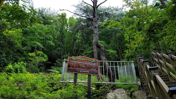 모습을 드러낸 천연보호수가 위풍당당하다. 쭉 뻗은 매끄러운 소나무가 둘인듯 하나가 되어 모습을 뽐낸다. 소나무 둘레로 안전시설이 설치되어있다.
