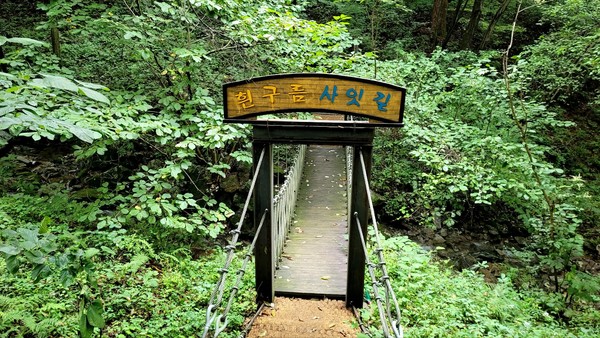 나무계단을 내려가자, 다리위로 흰구름사잇길 문패가 걸려있다.