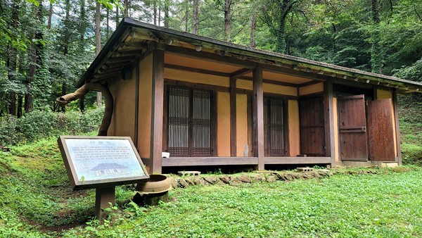 푸른 앞마당 뒤로 산촌집을 재현해 놓았다.