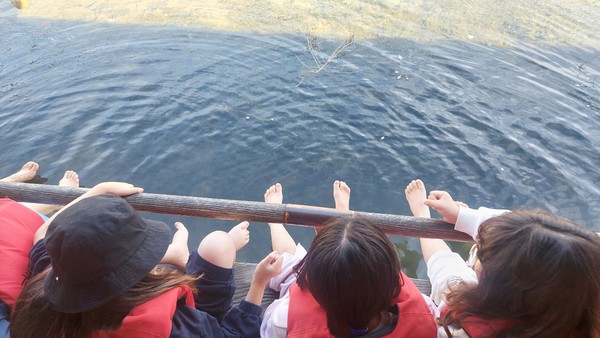 아이들은 발을 강물에 담근 채 뗏목을 타고 노를 저어보는 특별한 경험을 했습니다.