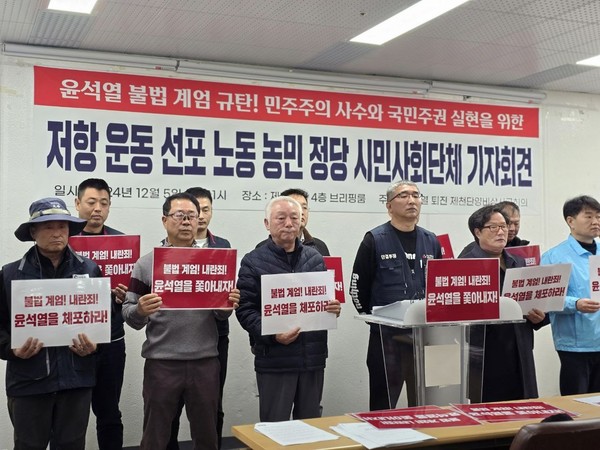 이들 단체는 5일 제천시청 브리핑룸에서 기자회견을 갖고 "윤석열 반헌법적 비상계엄 규탄! 민주주의 사수와 국민주권 실현을 위한 저항운동을 선포한다"고 밝혔다.