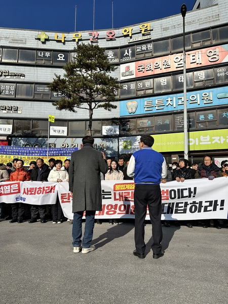 제천시민들이 7일 엄태영 국민의힘 국회의원 사무실앞에서 엄 의원에게 윤석열 대통령 탄핵 투표에 동참할 것을 요구했다.
