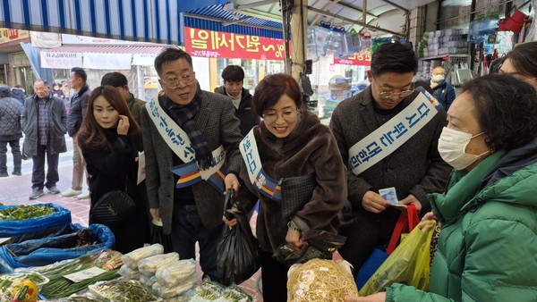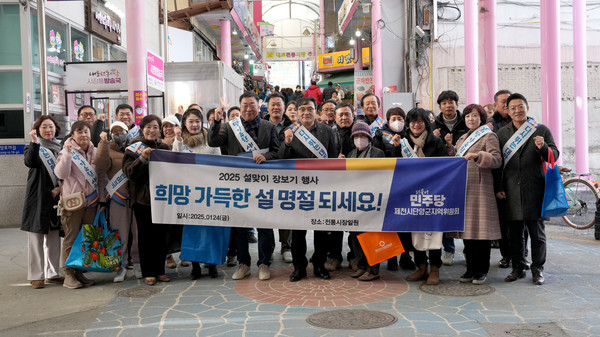 더불어민주당 제천 단양지역위원회는 24일 오후 2시 제천시 내토시장과 동문시장 일원에서 당원 50여 명이 참여한 가운데 설맞이 전통시장 장보기 행사를 열었다.