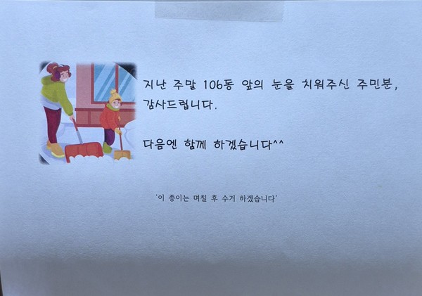 최근 아파트 주민들 간의 교류가 줄어들고 개인주의가 강해지는 시대 속에서, 이 같은 작은 배려는 더욱 빛을 발한다. 특히 기후 변화로 인해 폭설이 잦아지는 요즘, 서로 돕고 함께하는 모습은 더욱 의미가 크다.